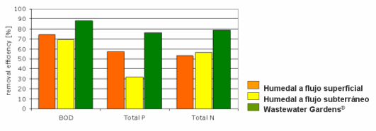 Comparación de la eficacia de purificación de los sistemas de flujo subterráneo WWG con la media de humedales a flujo superficial y subterráneo norte-americanos